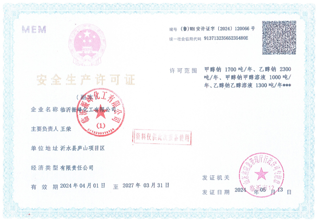 臨沂振峰化工有限公司安全生產許可證副本